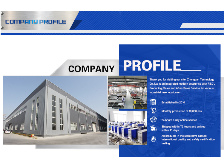 Zhongcan Technology Co.,Ltd. is a high development manufacture engaged in research , development , production and service of CO2 Laser Engraver , Laser Cutting Machine , Fiber Laser Marking Machine covering the line of arts and crafts processing , advertising , signs , University education ,medical industry , clothing processing , building models , wood furniture ,acrylic cutting , image carving and other industries .Based on China CCPIT and China Business Bureau support , we won lots of awards in exporting and Technological innovation . Our Company was founded in the year of 2012 , has more than 100 employees , and factory area over 2000 square.As a Leader of China B2B , B2C , our products are sold out to America , Europe,Middle East and South Asia.We have many agents and warehouses . Let us cooperate together , to work out best solutions for you to expand your business